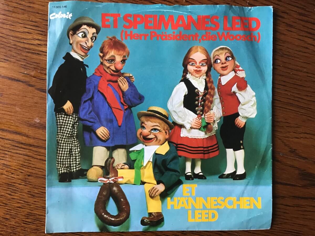 Den Rest dieser Strophe: „Sulang dä Pitter noch schläht, dä Speimanes noch speit“, kann ich selbst entschlüsseln. Weil ich nämlich schon mal in der Puppensitzung war! Der Speimanes gehört zum geschnitzten Ensemble des „Kölner Hänneschen“ und ist auf der Hülle der Single von 1975 (mein diesjähriges Karnevals-Souvenir) vorne in der Mitte abgebildet, mit Flönz (s.o.). Er ist die Figur mit der feuchten Aussprache – er speit – und verantwortlich dafür, dem Sitzungspräsidenten die soeben als Orden nach einem Auftritt verliehene Wurst, immer wieder zurück zu holen: „Herr Präsident, die Woosch“.