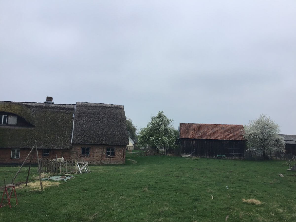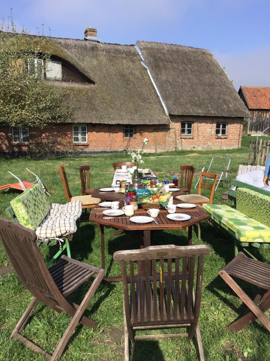 Wandelgut gGmbH Stand-, Wohn- und Wirkort Schlagbrügge: im alten Wohnhaus links erproben gemeinsam organisiertes Wohnen und solidarische Mietkonzepte, das denkmalgeschützte Reetdachbauernhaus zur Rechten möchte die gGmbH in diesem Jahr dazukaufen, um daraus einen Begegnungsort mit Nachbarschaftscafé, Dorfkneipe, Scheunenkino, Küche für alle (Küfa) machen; auf der angeschlossenen Obstbaumwiese stand der Altbaumschnitt an, und auch das Osterfrühstück ist eine Gemeinschaftsangelegenheit.