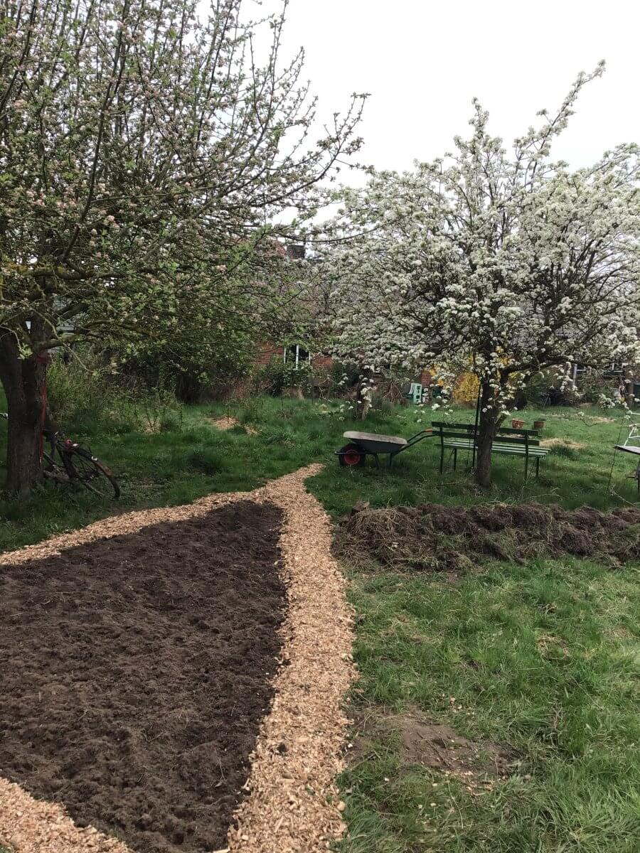 Am Morgen des Ostersonntags schwelge ich in Schlagbrügge im Anblick der Obstbäume und dem Summen unzähliger Insekten in ihren Blüten. Schl´ügge ist nicht nur gemeinschaftlich organisierter Wohn- sondern auch Wirkort. Marlene hat Grassoden zu einem Wall aufgeschichtet und umgegraben, das Ganze mit Rindenmulch umgeben, und „Wildsamen für den Bereich Nord“ ausgebracht. Das wird ein Wildblütenrasen – echt heimisch, echt wild, echt insektenfreundlich. damit nehmen die Gärtner*innen des Wandelgutes am Projekt „Tausende Gärten – Tausende Arten“ teil. Es wird durchgeführt unter anderen von der Deutschen Gartenbau-Gesellschaft 1822 e.V., Teil des Bundesprogramms „leben.natur.vielfalt“. Möge das Blühen gelingen!