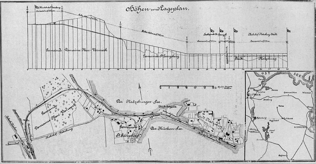 Unter ernst- und scherzhaftem Geplauder nähern wir uns auf der oben skizzierten Strecke Ratzeburg. Was auf der Karte oben rechts gut zu sehen ist, ist, dass die Bahn dort ein ganzes Stück westlich des Zentrums hält. Daher wurde 1902 eine Kleinbahnlinie vom Bahnhof Ratzeburg Land zur direkt auf der Stadtinsel gelegenen Haltestelle Stadt Ratzeburg errichtet; Gebrüder Borchers