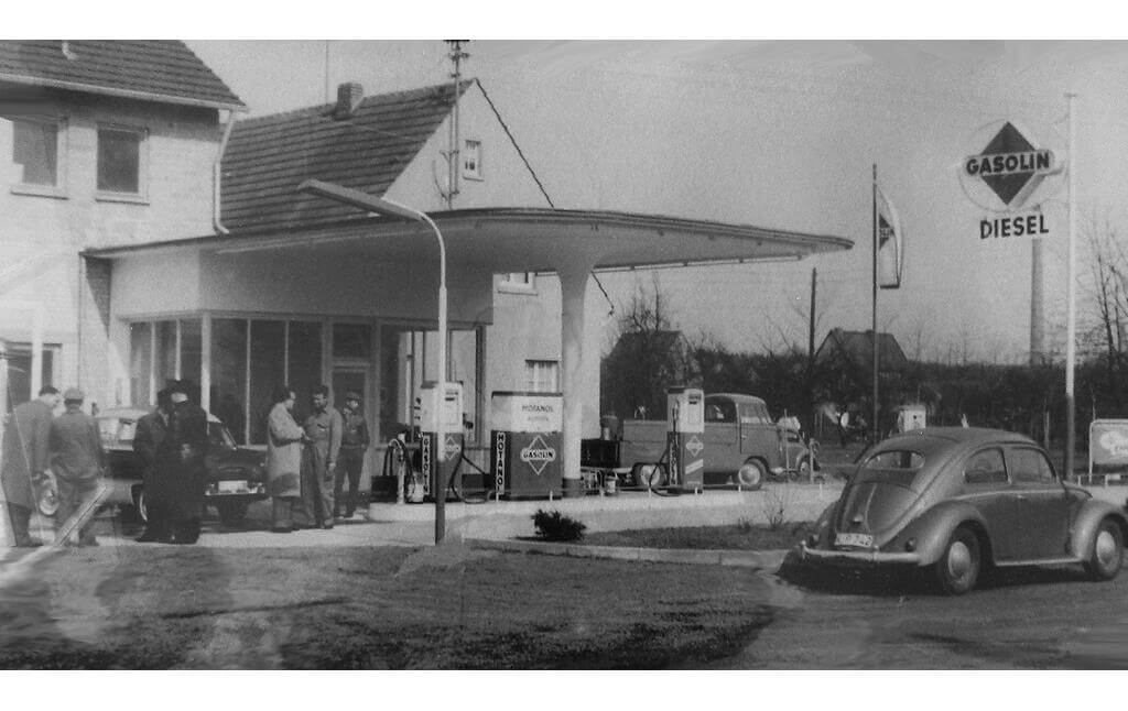Wie winzig so ein Käfer war! Hat aber auch gereicht und nicht soviel Benzin und städtischen Raum verbraucht wie die heutigen Familien-Fahrzeuge. Auf der historischen Aufnahme aus den 1950er-Jahren seht ihr eine sogenannte Typen-Tankstelle, rasch errichtet aus vorgefertigten Einzelteilen für Kassenhaus und Tankwartraum. Es gab dort nichts außer Benzin und Pannenhilfe. Aber wenn ich es richtig verstehe, macht Autofahren auch ohne „Naschies“ süchtig, besonders Männer um die 45 erklären mir: „Ich kann ohne Auto nicht leben!“. Gibt es eigentlich Anonyme Autoabhängige?