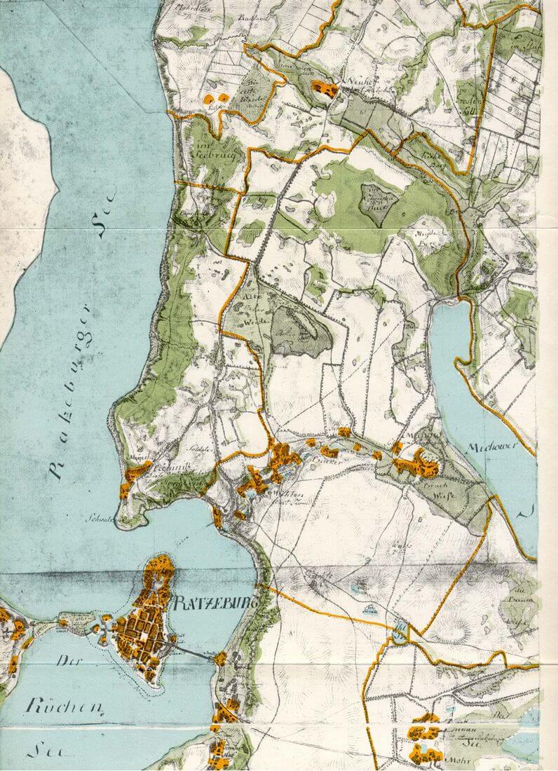 Auf dieser Karte von 1793 lässt sich meine einsame und einmalig schöne kleine Radtour vom Bahnhof Ratzeburg (der wurde erst gut 50 Jahre später drei Kilometer westlich der Stadtinsel errichtet, sozuschreiben außerhalb der Karte) zwischen Ratzeburger und Küchen-See über den Damm zur Vorstadt am anderen Ufer und dort ostwärts auf die nächsten Seen zu. Oben rechts auf der Karte ist das Südende des Mechower Sees zu erkennen, unten rechts das damals noch – und schon seit fast 600 Jahren – bestehende Dorf Lankow (siehe unten) und die moorige Niederung (Mohr) am Lankower See , Carl Friedrich von Wiebeking