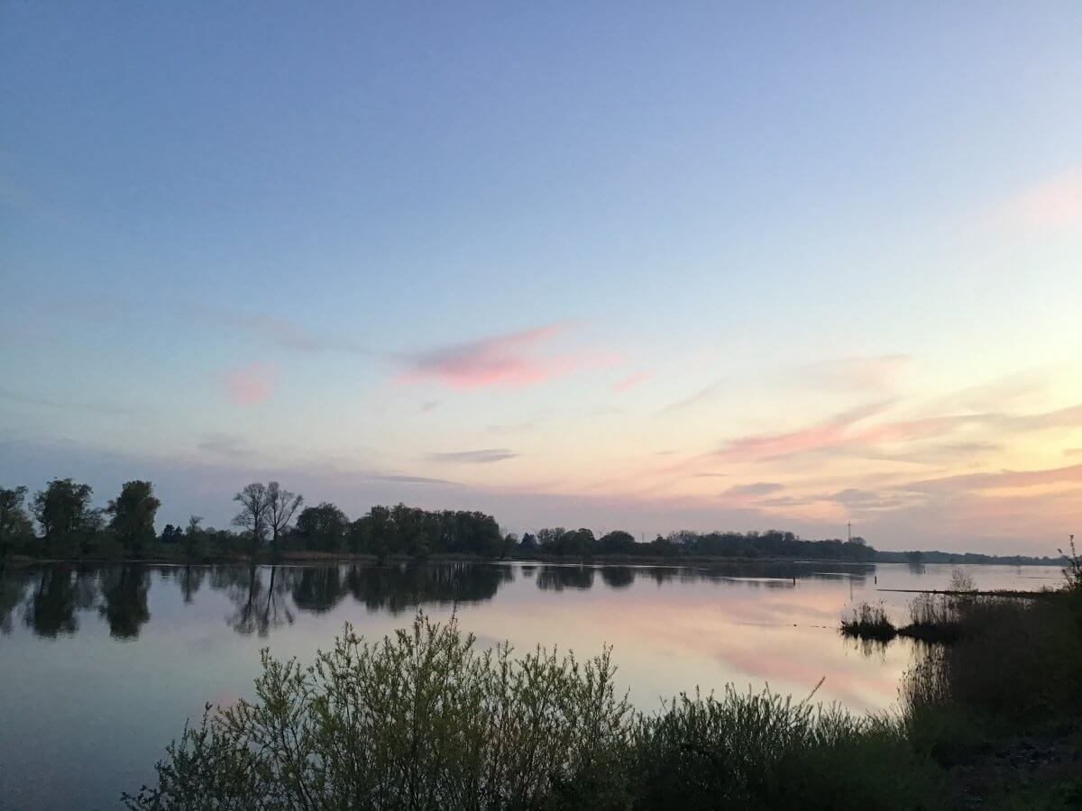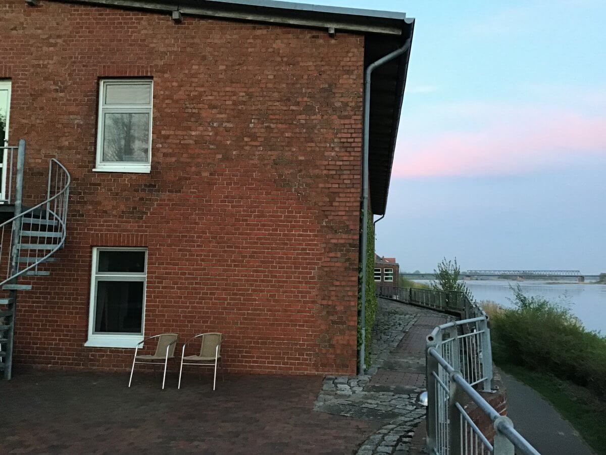 Von der völlig weltabgewandten Terrasse der Jugendherberge Lauenburg lassen sich die alten Ziegelmauern der ehemaligen Zündholzfabrik und die Brücke zwischen Schleswig-Holstein und Niedersachsen betrachten, auch das Biosphärenreservat Niedersächsische Elbtalaue, Teil des Biosphärenreservates Flusslandschaft Elbe, mein Reiseziel für den kommenden Tag (hatte schon die entsprechenden Fahrradkarten entfaltet, aber erstmal ging jetzt die Sonne hinter der unteren Mittelelbe unter. Und versetzte mich ins Träumen.