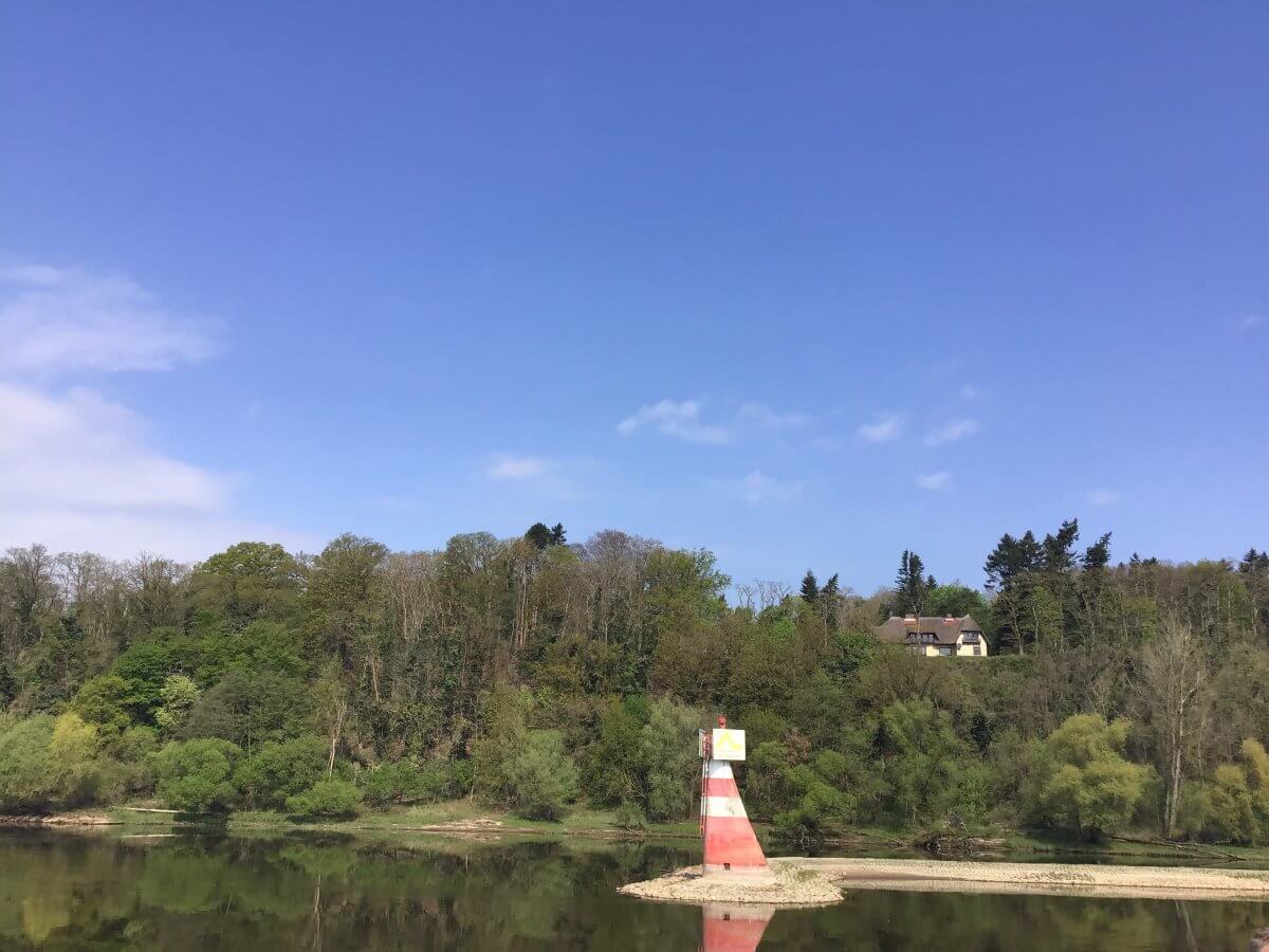 Die rote Bake an Backbord markiert auch die ehemalige deutsch-deutsche Grenze.