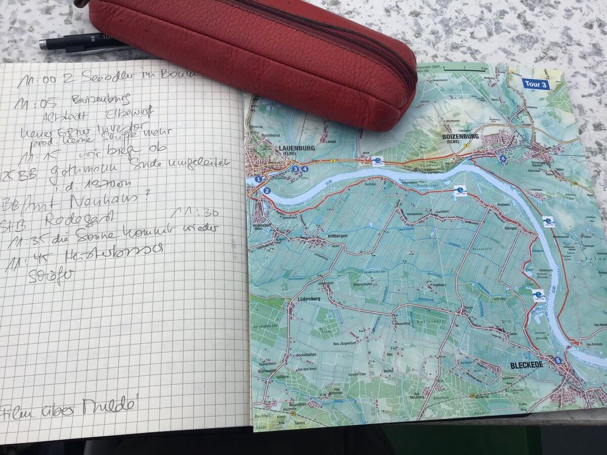 Ich verfolge das ganze auf meiner Radkarte – wollte ja eigentlich über die Brücke radeln und am niedersächsischen Ufer elbaufwärts. Dann wäre ich an Barförde vorbei gekommen, das unser Käptn um 10:45 Uhr ansagt.