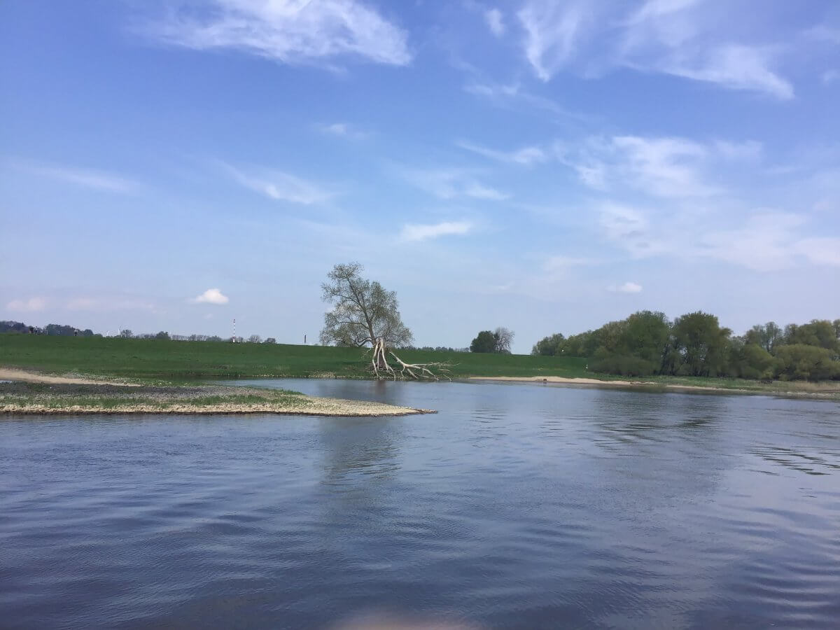 Wir passieren nun an Steuerbord Brackede und Bleckede mit ihren ausgedehnten Elbdeichvorländern. Das Biosphärenreservat Niedersächsische Elbtalaue schreibt zu diesem für Menschen teilweise kaum zugänglichen Lebensraum: „Durch Flutmulden und Flutrinnen, Altarme, Kolke sowie Sandauflagerungen ist das Bodenrelief zum Teil sehr bewegt. … Während des Frühjahrszuges finden sich … zahlreiche Wat- und Wasservögel ein. Dazu gehören Kiebitze (Vanellus vanellus), Stock- (Anas platyrhynchos), Pfeif- (Anas penelope), Knäk- (Anas querquedula), Krick- (Anas crecca), Löffel- (Anas clypeata), Spieß- (Anas acuta), Tafel- (Aythya farina) und Schnatterenten (Anas strepera).“ Viel los auf dem Vorland. Sandra und ich erfreuen uns an einem Bild von einem Baum. Es erzählt vom Sterben und vom Leben. Wir nehmen wieder Kurs auf Lauenburg, wo die Wölfin wartet.