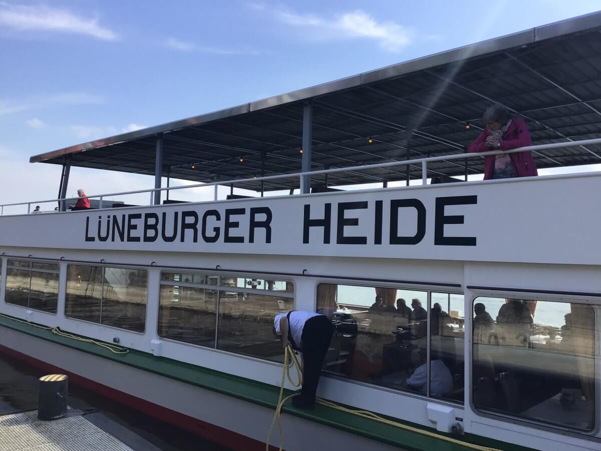 Auch der Frühstücksraum dieser Jugendherberge ist ein Traum, das Frühstücksbuffet ebenfalls, es waren sogar Ostereier darauf versteckt. Und dann kam Sandra zu meinem Tisch mit Müsli, Eiersalat und Schokolade. Und lud mich ein zu einer Schifffahrt ins Biosphärenreservat. Ohne Worte. Raffte meine Siebensachen, vor allem das Notizbuch, und begab mich zum Ruferplatz. Dort steht, gleich gegenüber meiner ehemaligen Pension und Gaststätte „Zum Rufer“ die gleichnamige Figur. Und am Ostermontag stand dort Sandra. Wir beide gingen an Bord der „Lüneburger Heide“.