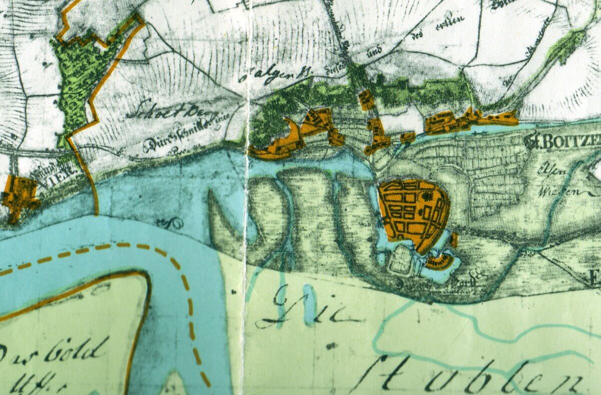 Boizenburg samt Wald und Wiese namens VIER auf der Wiebeking-Karte aus dem Jahre 1786; Carl Friedrich Wiebeking war Kartograf, Ingenieur, Architekt, Baubeamter im Wasser-, Straßen- und Brückenbau (auch im Berufsleben standen sie damals nicht so auf Monokultur …)