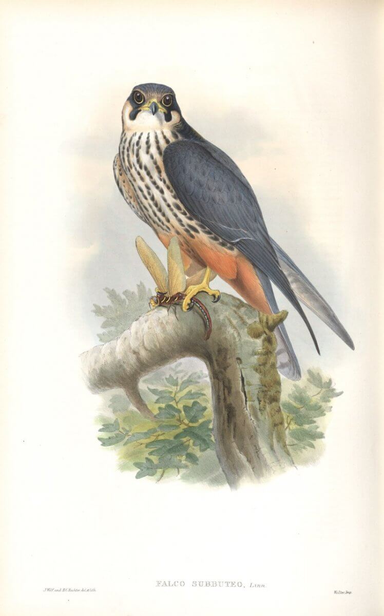 Der Baumfalke (Falco subbuteo), auch seine Bestände gehen mangels passendem Lebensraum zurück, 1873, John Gould