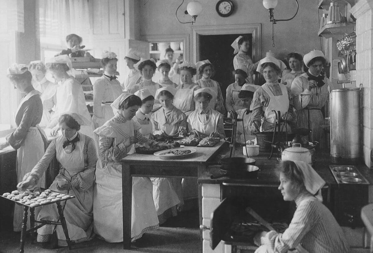 Elisabeth Östmanns Hauswirtschafts-Schule mit dem Personal von Stockholms „wichtigster“ Konditorei, Anfang des 20. Jahrhunderts