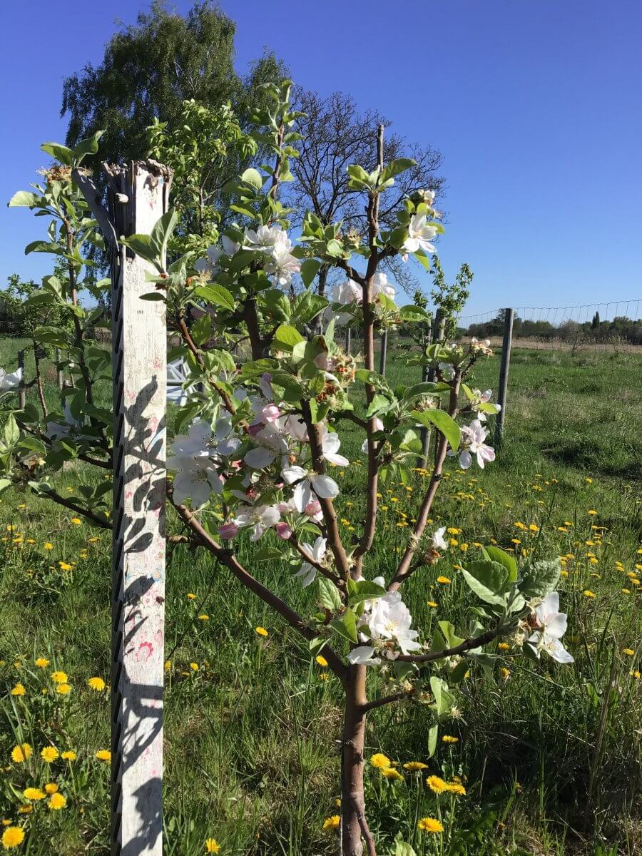 Weil der 2. Mai ja ein wenig bedeckt war, schiebe ich jetzt noch ein leuchtendes Bild von der Vorwoche nach, von der Apfelblüte in unserem werdenden Streuobstbau – regional typische Obstbäume mit tendenziell gärtnerischer Unternutzung, z.B. Erdbeerbeeten und Beerensträuchern – in den Hamburger Vierlanden: