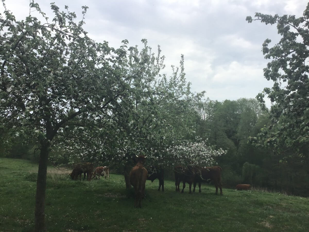 Ich hoffe, ihr könnt die braunen Rinder beim Futtern der weißen Obstblüten ausmachen, die Sonne verschwand in dem Moment, wo ich auslöste.