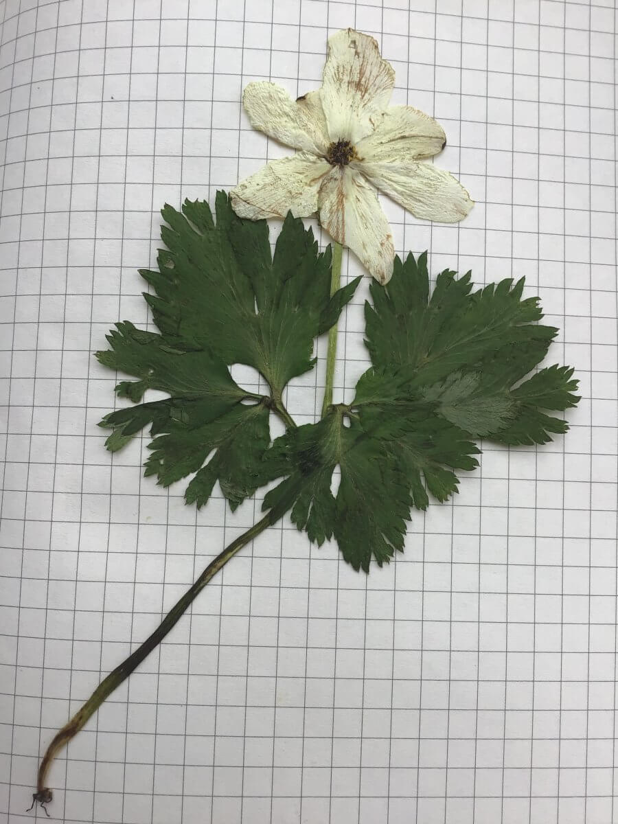 Ein paar Schritte weiter auf diesem weichen Waldboden, der mit vermoderndem Laub bedeckt ist und mit einer Krautschicht, die fast die gesamte Fläche bedeckt, stolpern wir über eine auffällige Blüte. Erst im Nachhinein konnte ich die gepresste Pflanze bestimmen: es ist das Große Windröschen.