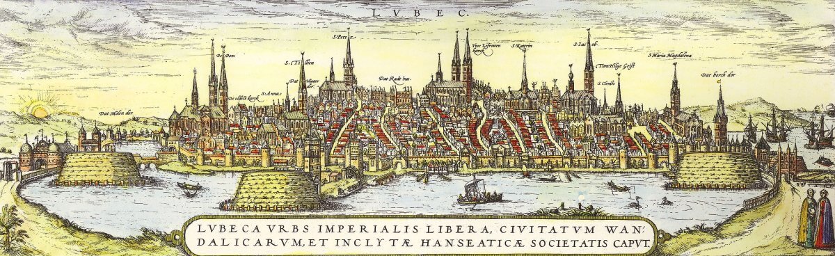 Blick von Westen (die Sonne geht hinter dem Holstentor linkerhand auf) über die Wakenitz auf Lübeck im Jahr 1600. Die Mengstraße, in der ich abstieg vom Rad, beginnt am geografischen Mittelpunkt der Altstadtinsel. Sie ist eine von deren historischen Rippenstraßen aus der Stadtplanung des 12. Jahrhunderts; auf der obigen Abbildung die zweite südlich des Dammes, gleich über der Mastspitze des Seglers.