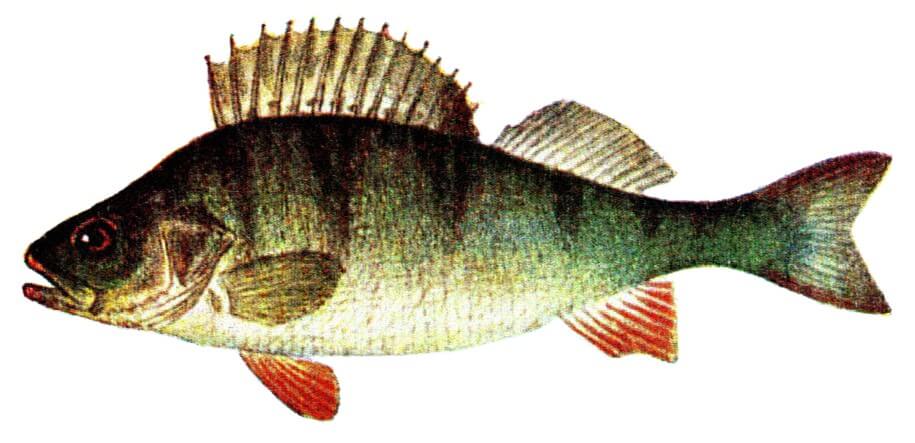 Perca fluviatilis, der Flussbarsch, gab der Wakenitz ihren Namen. Die Illustration stammt aus einem Kochbuch: