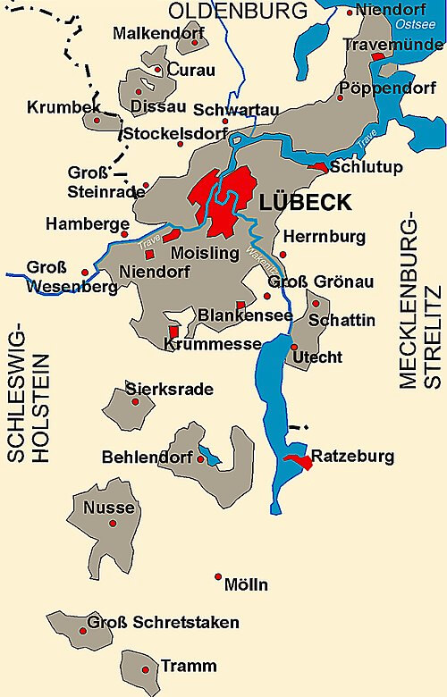 Diese Abbildung zeigt Besitzverhältnisse um 1937. Damals erließ die Reichsregierung Hitler 1937 ein Gesetz über Groß-Hamburg und andere Gebietsbereinigungen, durch das u.a. Mecklenburg Lübecker Exklaven im Tausch gegen seine Exklaven im Kreis Herzogtum Lauenburg in Schleswig-Holstein erhielt, das aber die Lübecker Forstflächen ausschloss. Die Hansestadt Lübeck besitzt weiterhin einen über Jahrhunderte gewachsenen Stadtwald. Die Karte oben zeigt auch die Wakenitz als natürlichen Abfluss des Ratzeburger Sees und meine Exkursionsziele Groß Grönau und Schattin.