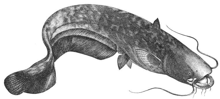 Einen schuppenlosen, schleimigen Körper, einen breiten abgeflachten Kopf mit zwei sehr langen Bartfäden auf dem Oberkiefer hat Silurus glanis, der Europäische Wels, 1886, H.G. Seelen