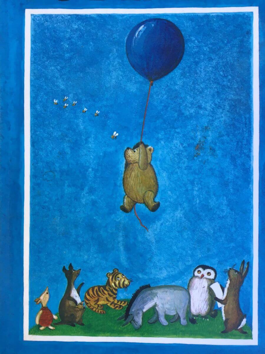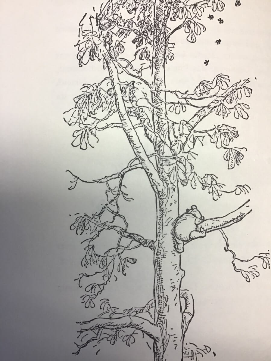 Von einem Luftballon in die Höhe transportiert, versucht Winnie-the-Pooh, an das Nest eines wild lebenden Bienenvolkes im „Biotopbaum“ zu kommen. Auf der Zeichnung von E. H. Shepard, dem Illustrator von Milnes Longseller – ihr gemeinsames Werk könnte eine heute wohl als Nature-Writing/-Sketching hypen – erklimmt die Hauptfigur einen hohen, alten Laubbaum: