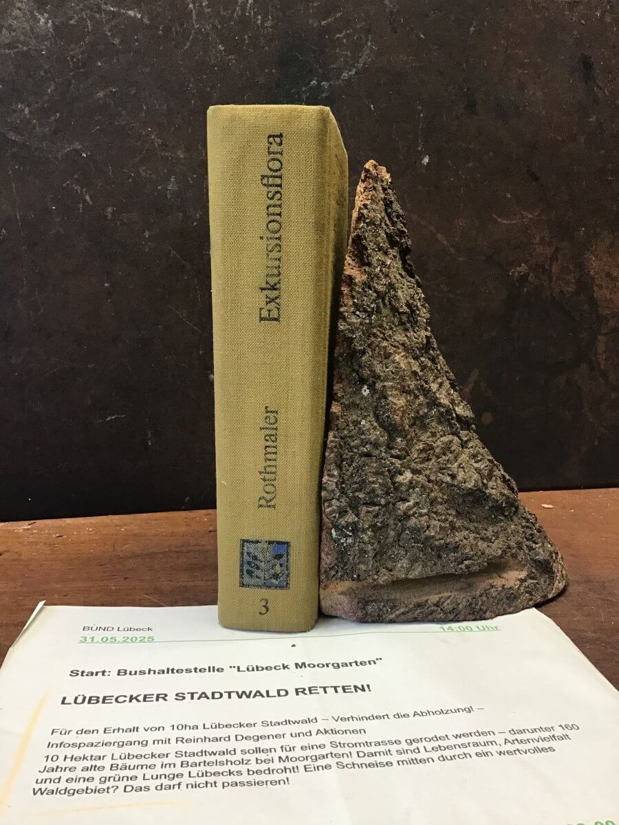 Stilleben mit Einladung (Infospaziergang gegen Abholzung, Samstag 31.Mai, 14:00, Bushaltestelle „Lübeck Moorgarten“, Lübeck), Bestimmungsbuch (Werner Rothmaler u.a., Exkursionsflora, Atlas der Gefäßpflanzen) und Eichenholz-Bücherständer aus der Fällung eines Baumes im seit mehr als 30 Jahren naturnah bewirtschafteten Lübecker Stadtforst.