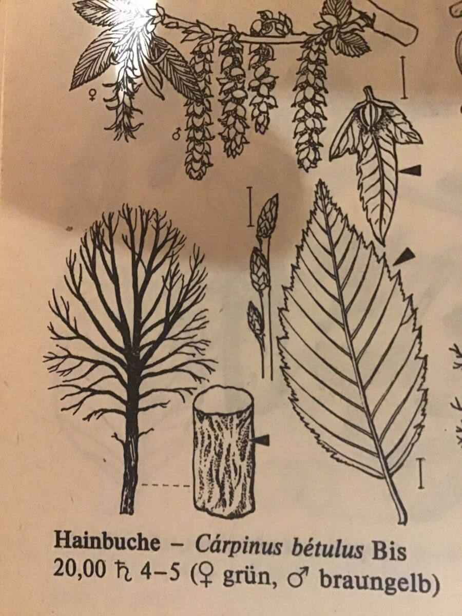 Carpinus betulus, die Hainbuche, gehört zur Familie der Birkengewächse. Ihre Borke ist grau, dünn und glatt und kann bei älteren Bäumen in Längsrichtung aufreißen. In meiner Exkursionsflora von Werner Rothmaler, die wissenschaftliche Abbildungen von mehr als 2800 Pflanzenarten enthält, verweisen kleine Pfeile auf die wichtigen Unterscheidungsmerkmale: