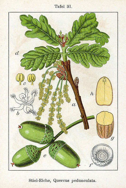 Quercus robur bzw. Quercus pedunculata heißt Stiel-Eiche auf Grund ihrer Früchte. Die kriegt eine aber nicht immer zu sehen, daher hier der Botanikerinnen-Hinweis: achte auf den kurzen „geöhrten“ Blattstiel, das Blatt wächst beidseitig neben der Blattmittelrippe einige Millimeter ohrförmig dem Ast entgegen. Sie ist die in Mitteleuropa am weitesten verbreitete Eiche und bevorzugt eher flache, kühlere und feuchte Gegenden, im Gegensatz zur Trauben-Eiche (unten).