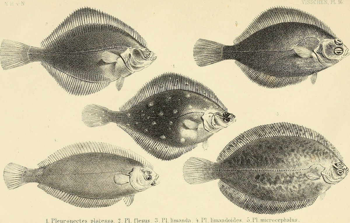 Da habt ihr sie die platten Fische: Oben links die Flunder alias Elbbutt; oben rechts die Kliesche; in der Mitte die Scholle; unten links die Doggerscharbe; unten rechts die Limande.