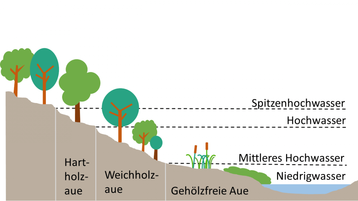 Diese Abbildung von Max Lankau zeigt den Zusammenhang zwischen Wasserstand und Auenwaldart, sie stammt aus der BUND-Broschüre „Lebendige Auen für die Elbe“ (https://www.bund.net/fileadmin/user_upload_bund/publikationen/fluesse/fluesse_elbeprojekt_abschlussbericht.pdf)