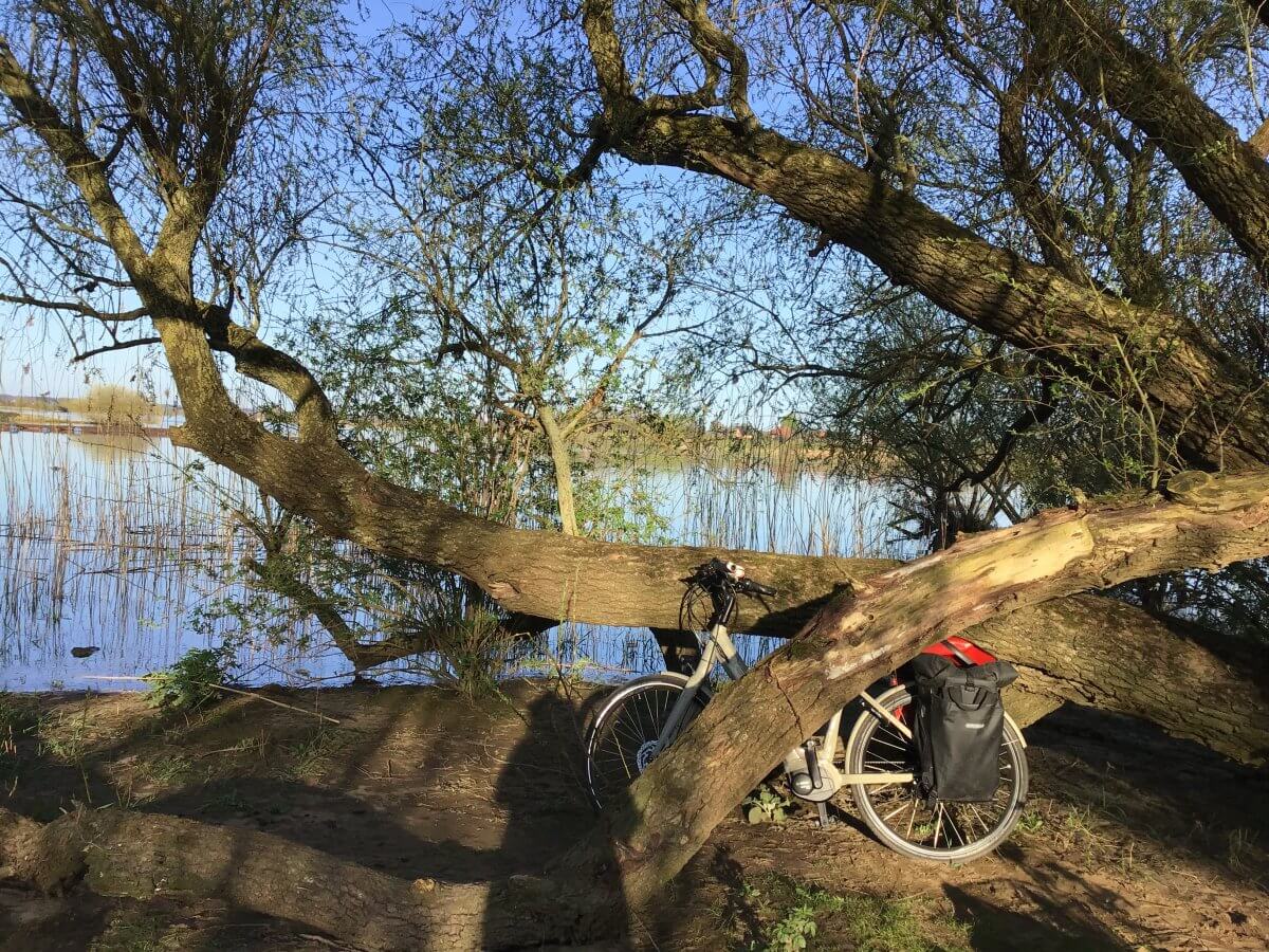 Weiden sind übrigens wahre Wunder! Als ich Mitte April mein Rad an den alten Baum lehne und mich in die knallige Frühlinssonne lege, zwitschert mir ein Vogel, den ich nicht zu Gesicht bekomme, aus der alten Weide etwas vor.