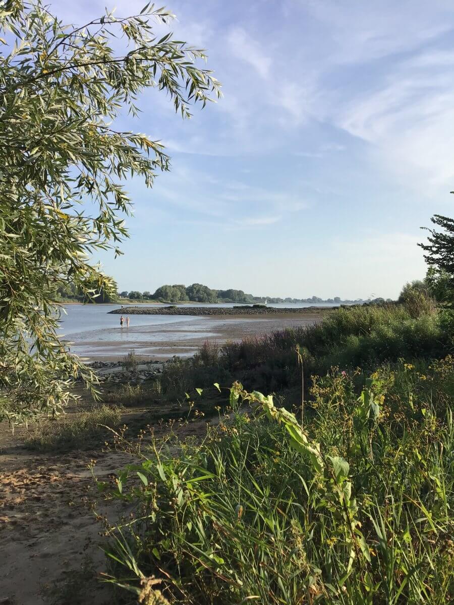 An so einem naturbelassenen Ufer geht eine bei auflaufendem Wasser über feinen Elbsand mit Genuss in den Fluss. Und die Wassergüte? Da fragt ihr im Prinzip genau die Richtige. Wir alten Fachfrauen sprechen gerne ausschweifend von chemischer Wasserqualität, aber meine jugendliche Antwort war total emotional. Sie entführt uns an ein anderes Gewässer und in die 1970er. Damals arbeitete ich am Vierwaldstätter See als ahnungslose Achtzehnjährige plötzlich eine Hotelküche, stellte für die Anhänger*innen von Maharishi Mahesh Yogi täglich mehrere mehrgängige Mahlzeiten her, rein vegetarisch und vorschriftsmäßig gut gelaunt. Und dann fragt eine der anderen für ein paar Monate in die Schweiz gereisten transzendental Meditierenden mich dort plötzlich, wonach ich mich sehne, wenn ich an Hamburg denke. Sofort überdeckt ein durchdringend süßliches Aroma den Duft der Curries: