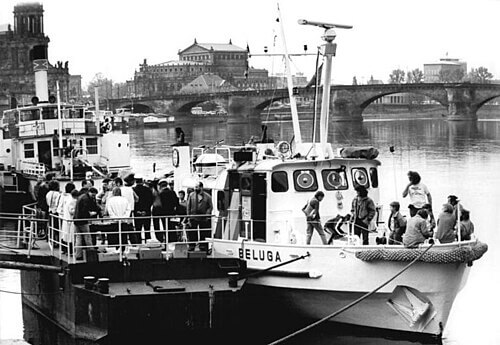 Als die Umweltschutzorganisation Greenpeace im Frühjahr 1990 zum ersten Mal über die nun ehemalige deutsch-deutsche Grenze hinweg elbaufwärts fuhr, zu Wasseruntersuchungen mit dem ehemaligen Löschboot „Beluga“, benannt nach dem weißen Wal, der manchmal in Flüsse einwandert, hatte ich mich mich als chronisch Umweltbewegte nach dem Verlassen des eher statischen „Bürotops“ bei der Umweltbehörde entschieden, anderswo schreibend und sprechend möglichst viel in Sachen Umwelt zu bewegen. Und absolvierte als angehende Journalistin in Presse- und Öffentlichkeitsarbeit (so hieß die Fortbildung) ein Praktikum bei Greenpeace Deutschland. Die Pressestelle im Headquarter der Umweltorganisation nahe der Hamburger Landungsbrücken, in einem abgelegenen Turmzimmer, bekam zu jenem Zeitpunkt weltweite Bedeutung. Es hatte sich quasi auf allen Kontinenten herumgesprochen, dass Greenpeace zum ersten Mal die Verschmutzung der Elbe durch DDR-Betriebe untersuchte. Und alle riefen an – bis auf die Leute von der Beluga, die lagen nämlich dort im (Urstrom-)Tal der Seeligen, wie in der DDR die Gegenden jenseits des mobilen Telefonierens hießen. Und ich war ganz allein, denn die offizielle Greenpeace-Pressesprecherin war durch eine Grippe sprachlos, und bei mir klingelte es auf allen Apparaten, hatte keine Sekunde Zeit, um Hilfe zu holen. „You are on air!“ brüllte mich ein US-Amerikaner an, heißt soviel wie: Was du sagst, wir sofort gesendet. Und ich durfte zwar eigentlich öffentlich gar nicht für Greenpeace sprechen, ging aber á la Oma vor. Da halfen jetzt auch meine jahrzehntelangen Erkenntnisse und Erfahrungen in Sachen Unterelbeindustrialisierung und so. Denn ich musste improvisieren, wusste ja zu jenem Zeitpunkt gar nicht, was meine Kolleg*innen herausgefunden hatten. Der Allgemeine Deutsche Nachrichtendienst ADN, die Bild- und Nachrichtenagentur der DDR, schrieb am 18. April 1990, als das Laborschiff Beluga am Terrassenufer in Dresden Station machte (Foto oben), über die ersten Ergebnisse unter anderem, Greenpeace wolle mit dieser Aktion zugleich nachweisen, dass nicht nur DDR-Betriebe, sondern auch BRD-Firmen an der Elbe-Verschmutzung beteiligt sind. Bundesarchiv, Bild 183-1990-0418-032 / CC-BY-SA 3.0