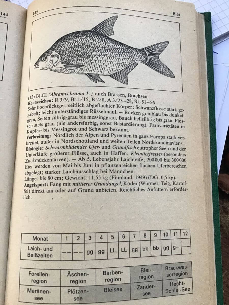 Unser Angler steht – nach der Fließgewässereinteilung der Fischereibiolog*innen nach dem Hauptnutzfisch, die ich zu dieser Gelegenheit wiederhole – in der in der Blei- bzw. Brachsenregion. Abramis brama heißt der für die Vier- und Marschlande „zuständige“ Nutzfisch oder Blei, Brachse, Brassen, wird bis zu 70 Zentimeter lang, und damit ihr euch ein Bild machen könnt von diesem „Kleintierfresser“, wie er in „Wir angeln“ genannt wird, gibt es jetzt ein bräunliches Foto daraus: