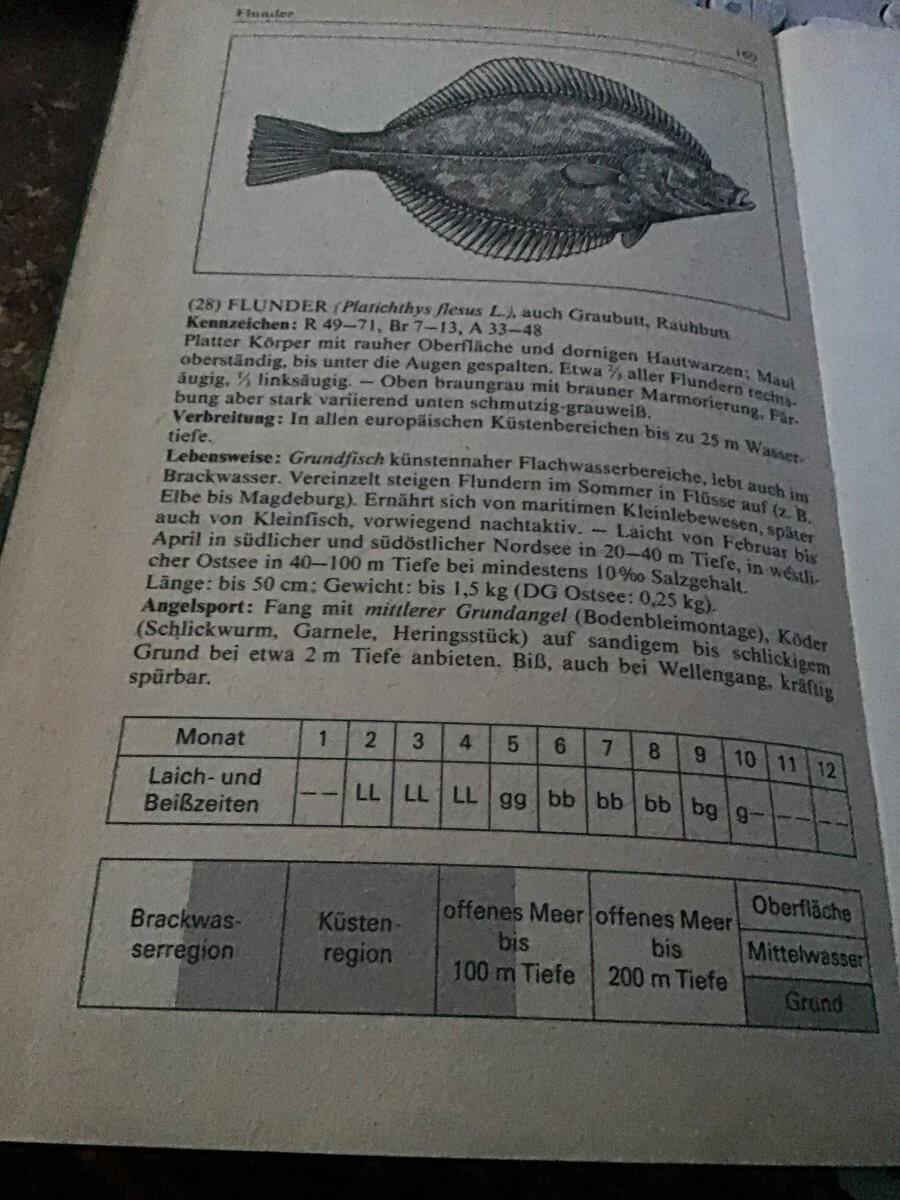Ansonsten hat der Mann nicht Latein vertellt, sondern fast recht mit seiner Ansage, es gebe vor Neuengamme „alle Fische“, denn dieser Teil des Unterlaufes ist die artenreichste Fischregion. Er sagt, sie würden dort auch Schollen angeln. Der lateinische Name ist Pleuronectes platessa, das begehrte Meerestier wird auch als Goldbutt betrieben, aber dass es in der Hamburger Elbe vorkommt, ist wohl wirklich Anglerlatein. Oder eine Verwechslung. Denn die Flunder, Pleuronectes flesus, könnte es tatsächlich bis Neuengamme schaffen. Wir konsultieren hier nochmal den Leitfaden für Anfänger und fortgeschrittene Angler des Sportverlages Berlin: