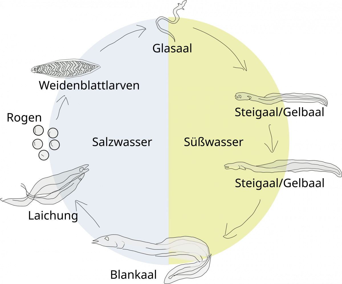 Die in der Sargassosee (im Atlantik, östlich von Florida, bei den Bahamas) geschlüpften Weidenblattlarven des Europäischen Aals brauchen drei Jahre, um von dort an die europäischen Küsten zu gelangen. Sie werden nicht vom Golfstrom getragen, wie ich es noch im Studium gelernt habe, sondern schwimmen aktiv. Etwa 100 Kilometer vorm Ziel verwandeln sie sich in die etwa sieben Zentimeter langen Glasaale, die wiederum, während sie flussaufwärts schwimmen, zu den sogenannten Gelb- oder Steigaalen werden. Bis die Aale dann in einem europäischen Binnengewässer geschlechtsreif werden, dauert es bei den Weibchen zwölf bis fünfzehn, bei den männlichen Fischen sechs bis neun Jahre. Dann wandern die Aale dahin zurück, wo sie geschlüpft sind, legen ohne Nahrungsaufnahme bis zu 5000 Kilometer zurück – das ist der Grund für ihre von Konsument*innen geschätzten Fettreserven – verwandeln sich ein letztes Mal, in sogenannte Blankaale, pflanzen sich nur einmal im Leben fort. Wenn das für Freizeitfischer und auch Konsument*innen kein Grund ist angesichts der Bedrohung dieser wundervollen Art, Finger davon zu lassen… Salvor Gissurardottir.