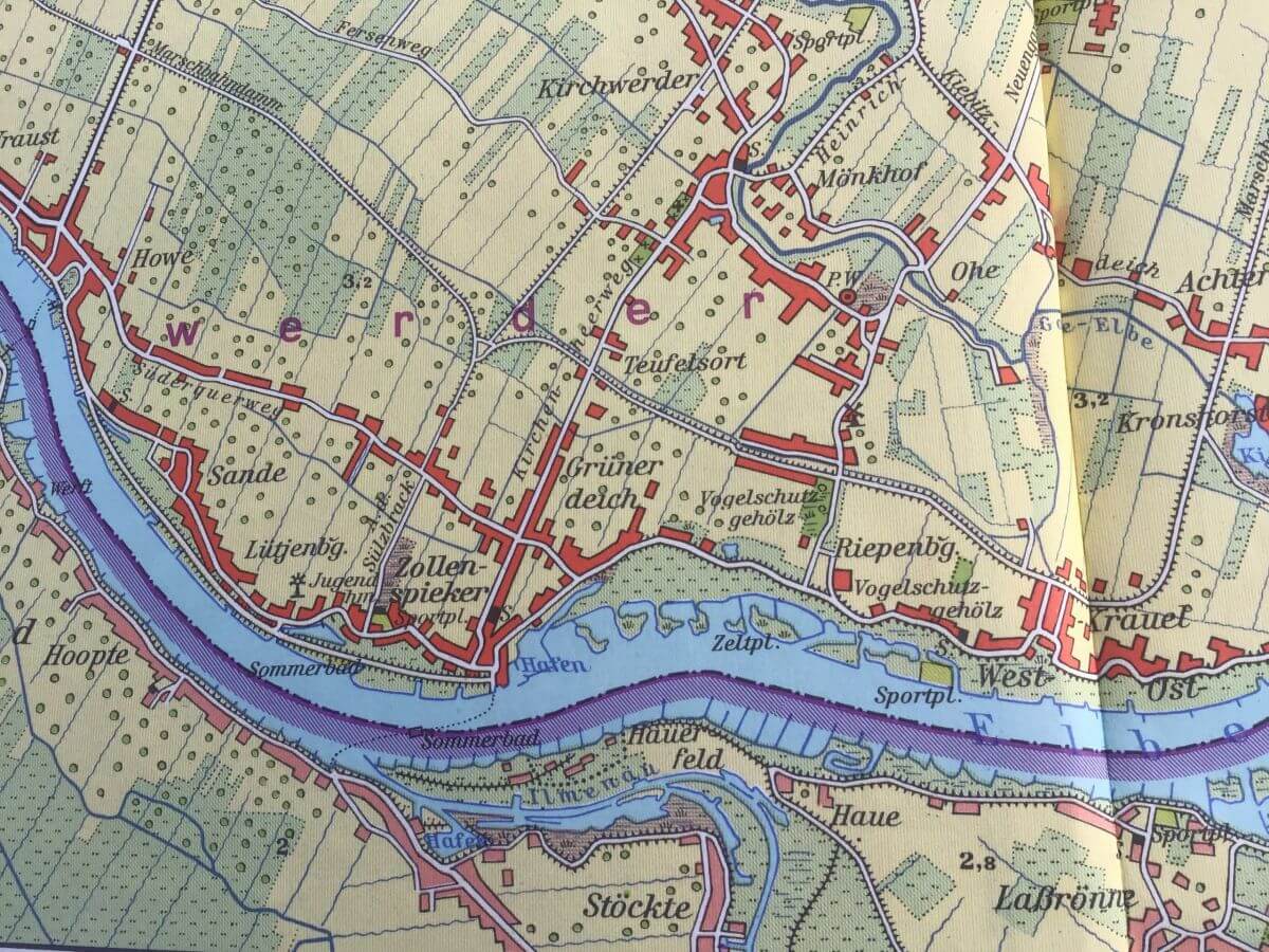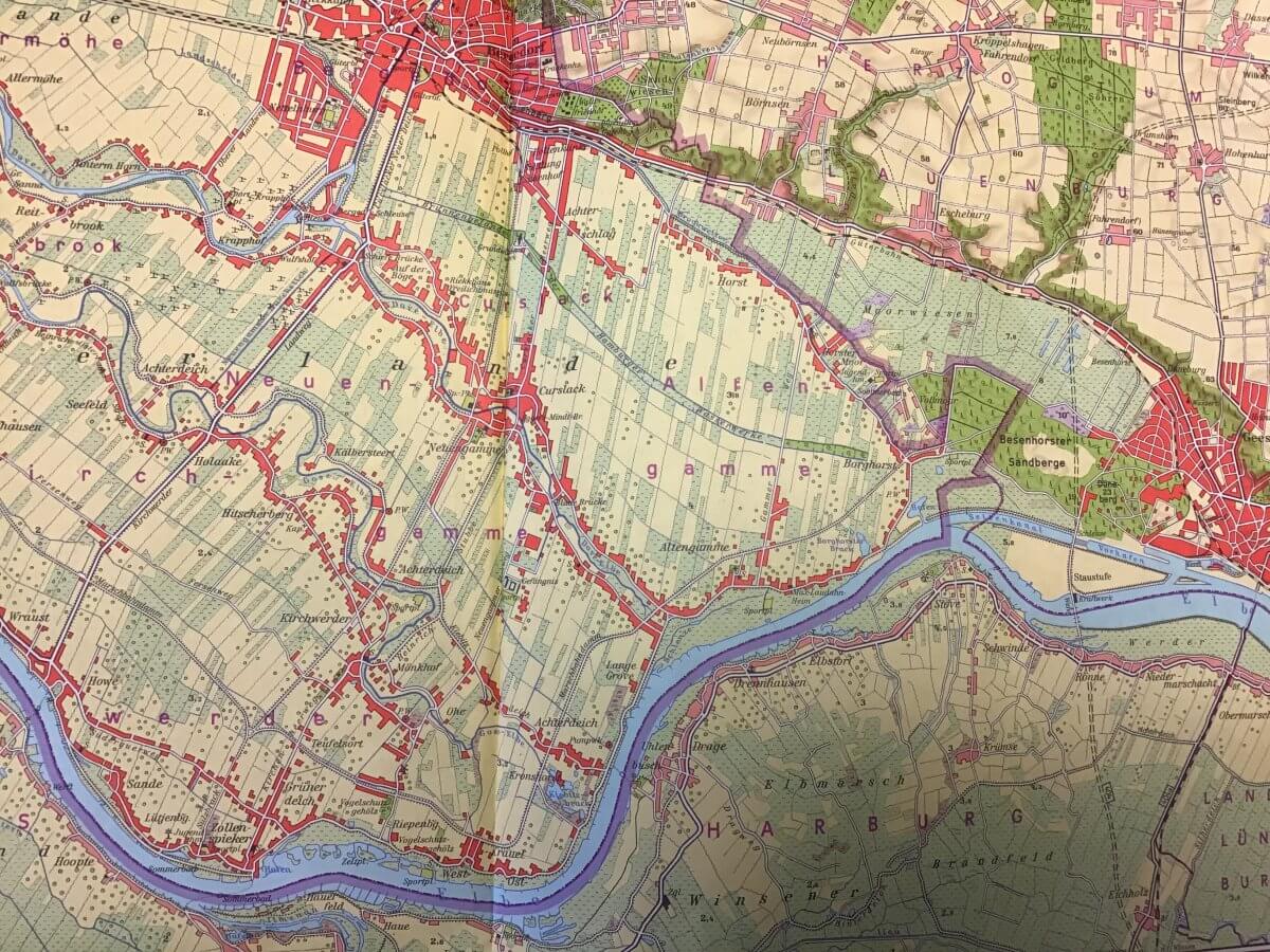 … wo alles vor rund 700 Jahren anfing, weshalb dies kein Newsletter sein kann. Viele alte Geschichten, Döntjes sagen die Einheimischen, beginnen mit der Elbe. Die lebt noch heute: „Tag: 18 Mo/August/HW-Zeit 11:55“, steht im Gezeitenkalender. Dieses handliche Heftchen erstellt Jahr für Jahr das Amt für Seeschifffahrt und Hydrographie, kurz BSH. Es wacht über Hochwasser(HW)- und Niedrigwasser(NW)-Zeiten der Deutschen Bucht und ihrer von Ebbe und Flut beeinflussten Flussgebiete an Hamburgs nördlichem Elbufer, auf der hohen Geestkante. Ich komme dran vorbei, wenn ich mit dem Rad von meiner Nachbarschaft – schreib auch gern Hood, weil dieses Wort für die nähere Umgebung und ihre Bewohner*innen sich so gemütlich anhört – im mittlerem Westen der Stadt gen Neuengamme, diese Hood liegt auf der Karte unten etwa zwischen Zollenspieker und Altengamme. Von der opulenten Rückseite des BSH an der Promenade zur Erholung, mit exquisitem Hafenblick, rolle ich knapp hinterm Michel runter ins Urstromtal. Bis zu acht Meter breit, wird es im Norden und Süden von den höher gelegenen Geestgebieten begrenzt. Zwischen diesen Abhängen und der Stromelbe befindet sich unser Schauplatz, die ebene Marsch der Unterelbeniederung, in Teil 1 der Döntjes spielen sie vor allem vorm Deich, direkt an der „Großen Elbe“, wie meine Neuengammer Nachbarin den Badefluss ihrer Kindheit – vorm Bau des Hauptdeiches – nennt.