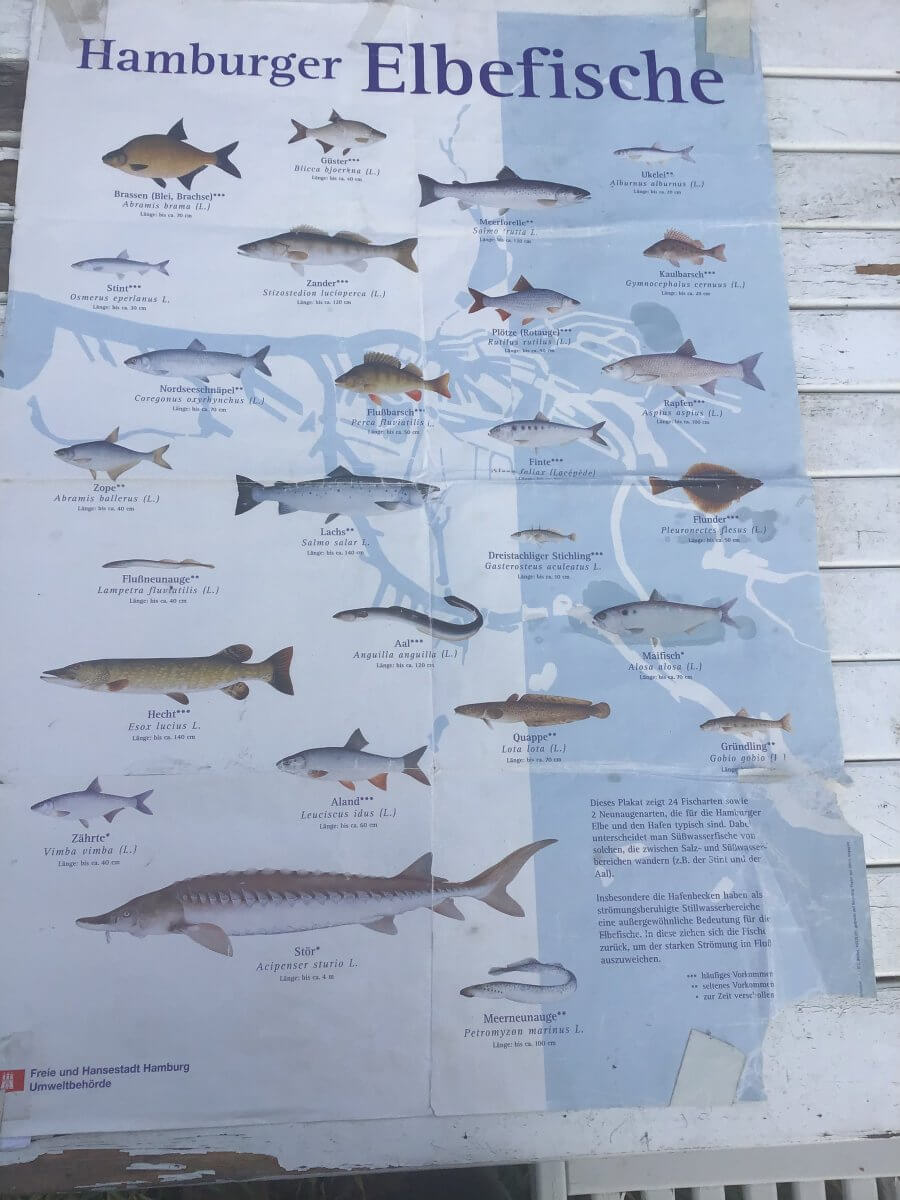 Alle Fische? Als eifriges Mitglied der AGUI (Arbeitsgruppe gegen Unterelbeindustrialisierung, sie traf sich im Zoologischen Institut der Hamburger Universität und die Zoolog*innen hielten uns in Sachen Fischkrankheiten, z.B. Blumenkohlgeschür beim Aal, aufs Ekligste auf dem Laufenden, aber wir wollten uns ja den erfreulicheren Aspekten der Tierwelt zuwenden) hatte ich drauf, dass die Elbe einst einer der fischreichsten Flüsse Europas war. Von den für die Hamburger Elbe typischen 24 Fisch- und zwei Neunaugenarten galten drei als verschollen, als ich Ende der 1980er bei der Hamburger Umweltbehörde arbeitete, zuständig für die Erstellung eines allgemeinverständlichen Gewässergüteberichtes: Maifisch, Stör und Zährte.