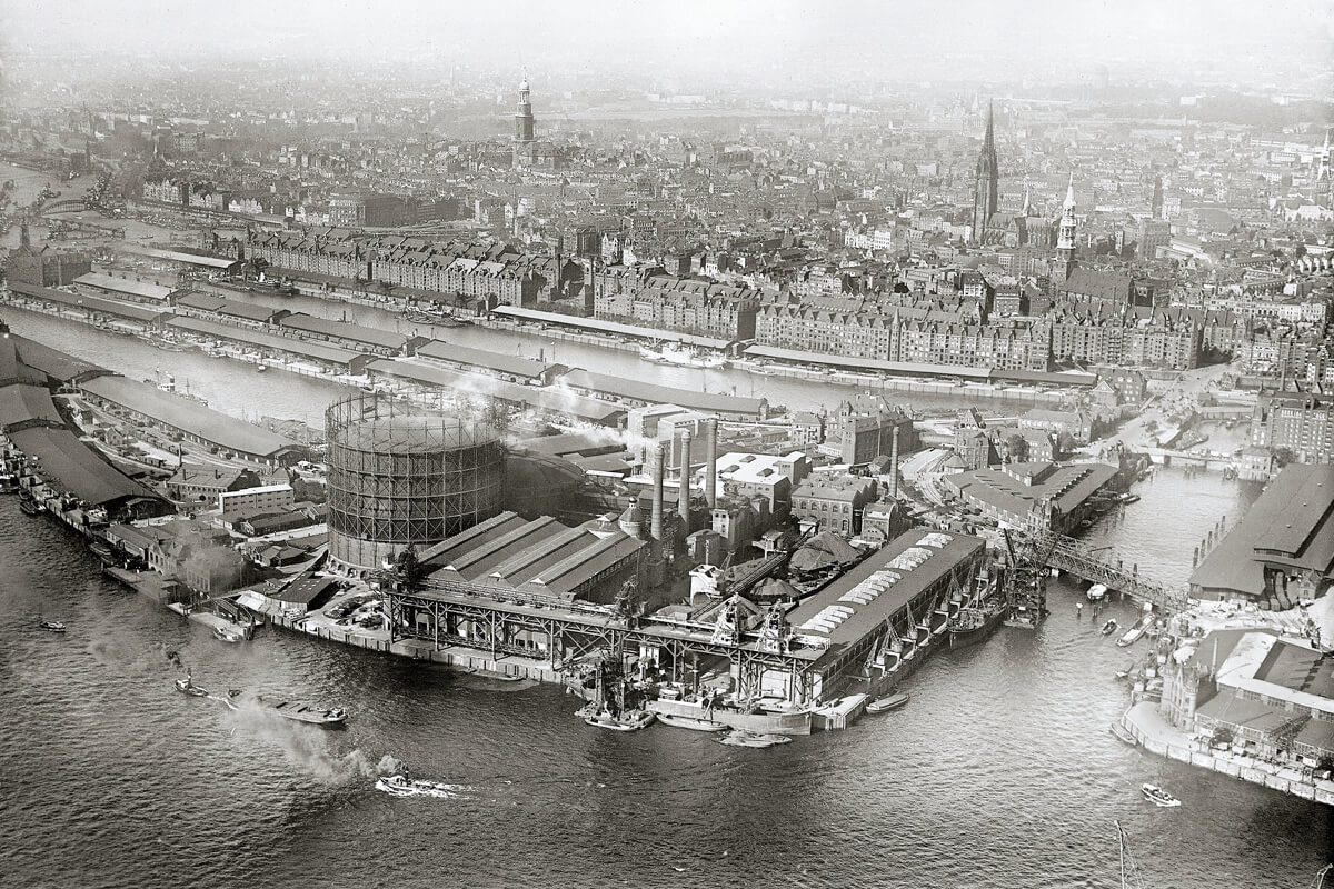 Westlicher Grasbrook um 1930, im Hintergrund die Speicherstadt und die Türme der Innenstadt