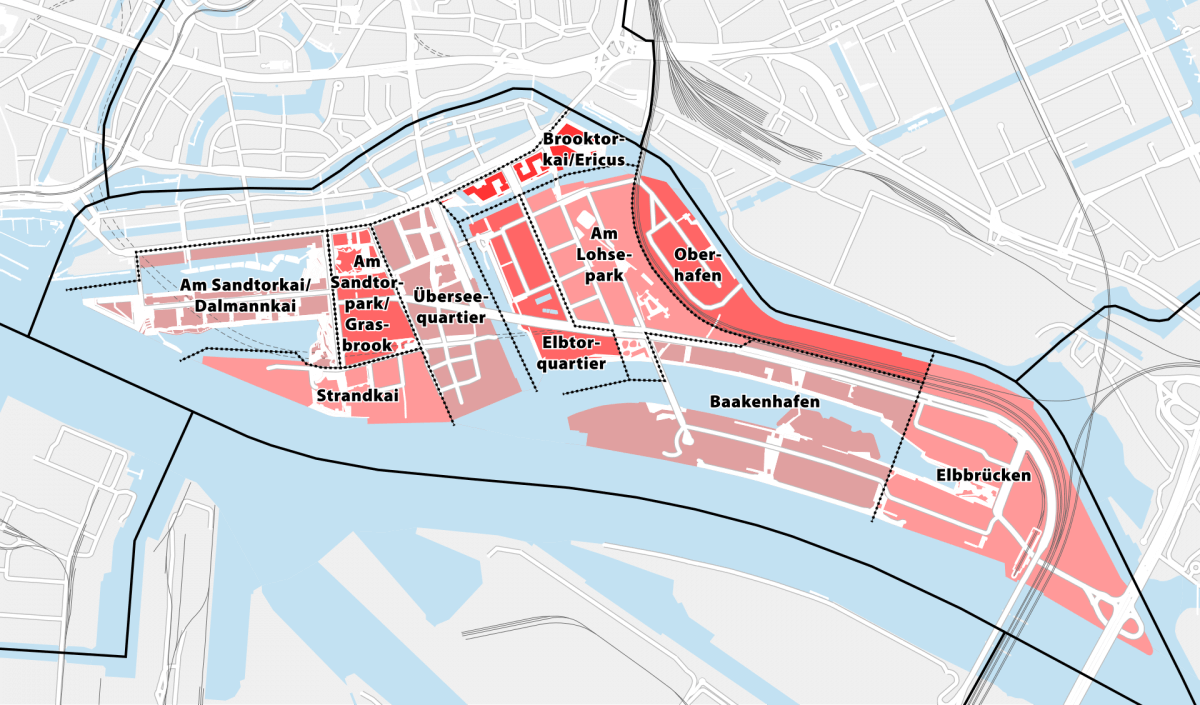 Habe diesen neuen Stadtteil einmal kurz ausprobiert, bin durch den steifen Zug zwischen den hohen Gebäuden fast von der schicken Liege geflogen und zweimal (wirklich!) in dieser Autofahrer-City – auch das Radwegenetz fiel den Zuständigen erst ein, als es fast zu spät war und die Halter von großen Privatfahrzeugen fühlen sich dort besonders zu Hause, so scheint es. Habe auch mal gesehen, wie jemand in eine Gruppe von Erstklässlern hineinfuhr, zugegeben fuhr er langsam, die gerade bei Grün einen Zebrastreifen überquerten. Aus all diesen Gründen müssen meine auswärtigen Gäste sich dort ohne mich umschauen, ich ertrage diese Unwirtlichkeit nicht und umfahre sie auf der Straße Am Zippelhaus nördlich. Karte der Quartiere des HafenCity-Projekts (rot), NordNordWest