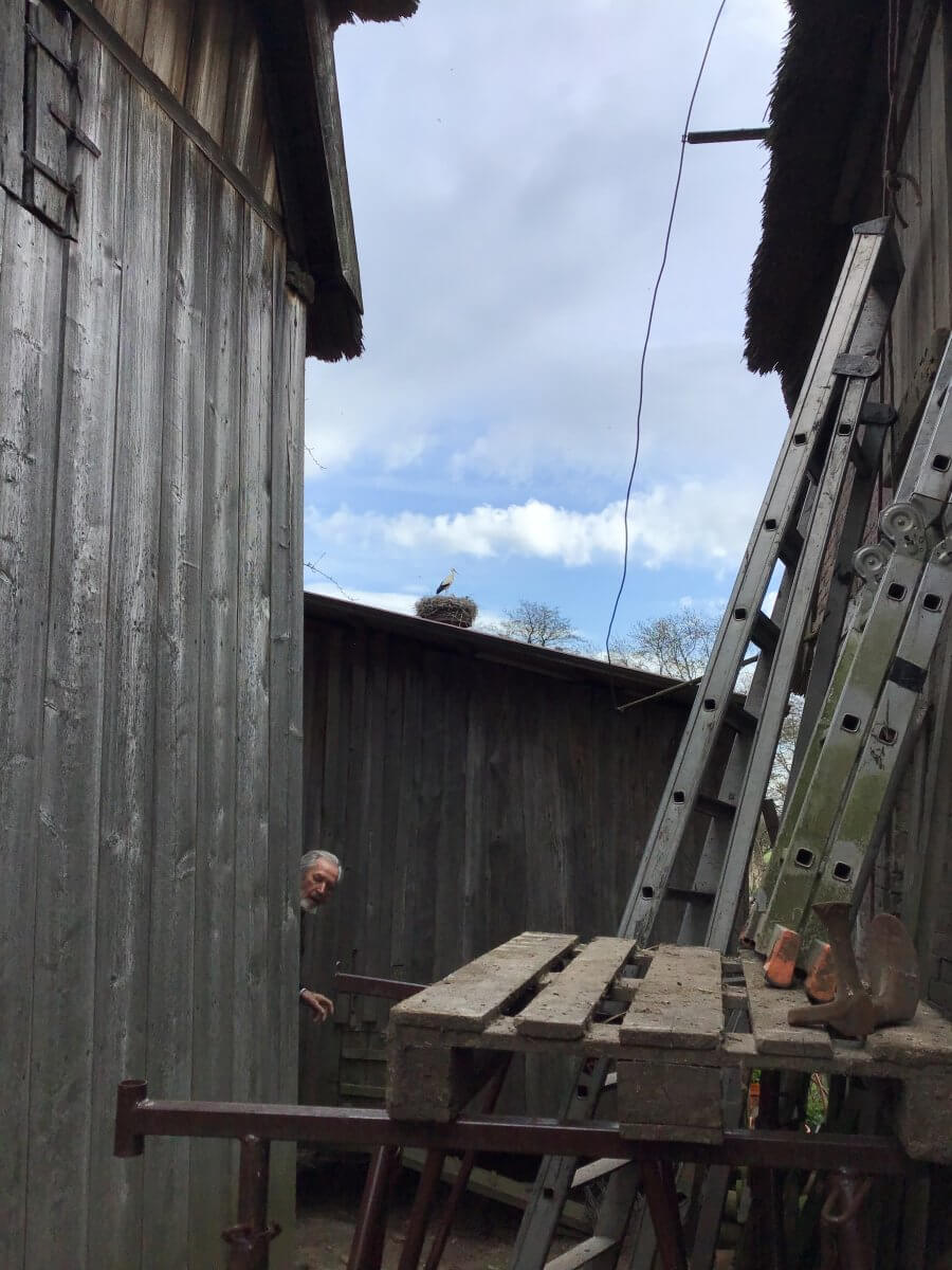 Es werde recht viel geredet, sagt Georg Eggers, der den Hof seiner Familie schon …. auf die ursprünglich dort übliche Bewirtschaftung umgestellt hat. Der Schnappschuss vom Mai zeigt ihn mit Storch im Hintergrund, als er einen alten Melkschemel vom uralten Kornspeicher des Hofes Eggers in der Ohe holte. Der Schemel diente dann an einer Grundschule in Hamburgs „mittlerem Westen“ als Vorbild für mobile Sitzgelegenheiten für junge Naturmaler im Grünzug Altona. Und Georg und ich schmieden Pläne, wie wir – vielleicht auf dem städtischen Gut Riepenburg – altes und neues Wissen unters junge Volk bringen können.
