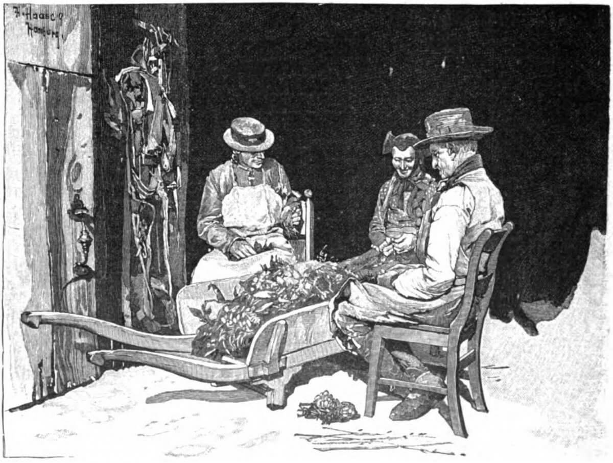 Beim Sortieren der Maiblumenkeime, so heißt diese Illustration zu einem Artikel von Oskar Schwindrazheim in „Die Gartenlaube“ von 1898. Sie stammt von seinem Mitstreiter – beide nannten sich „Hamburger Pflanzenkünstler“ – Herrmann Haase.