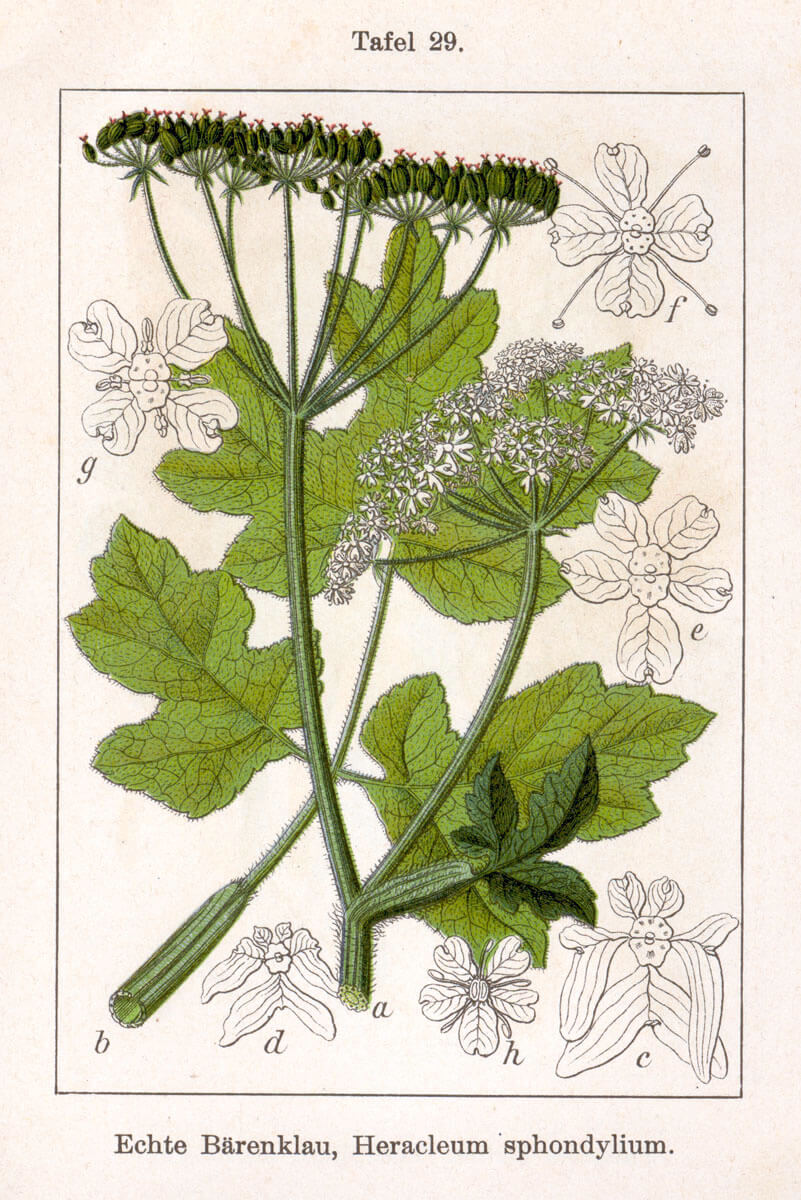 Der Echte oder Wiesen-Bärenklau ist im Gegensatz zum Riesen-Bärenklau eine in Europa heimische Pflanze. Sie wird von der auf Doldenblütler spezialisierten Bärenklau-Sandbiene als Pollenquelle genutzt und ist Raupen-Futterpflanze für diverse Schmetterlingsarten: Silberpunkt-Höckereule, Weiderich-Blütenspanner, Bärenklau-Rauhaareule, Mondfleckiger Blütenspanner, Haarstrang-Blütenspanner, Brustwurz-Blütenspanner, Bärenklau-Blütenspanner und Purpurglanzeule. Das merkt ihr euch jetzt einfach alles, weil wir nachher noch auf die so bedeutsamen Wildpflanzen und -tiere am Rande von Feld und Weide kommen;). 1796, Jacob Sturm: Deutschlands Flora in Abbildungen