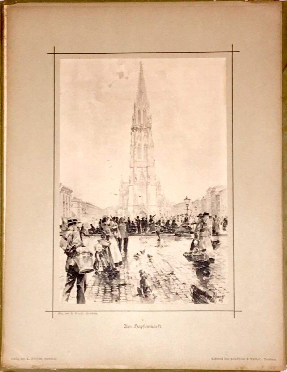 Dieses Aquarell von Herrmann Haase zeigt den Hopfenmarkt stammt aus einem Buch, das ich mir unbedingt zu Weihnachten schenken muss: „Malerische Ecken & Winkel Hamburgs“. Es zeigt den Hopfenmarkt, der seinerzeit unter anderem von Vierländerinnen beliefert wurde.