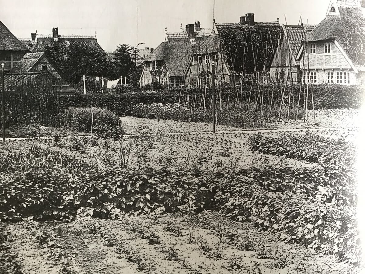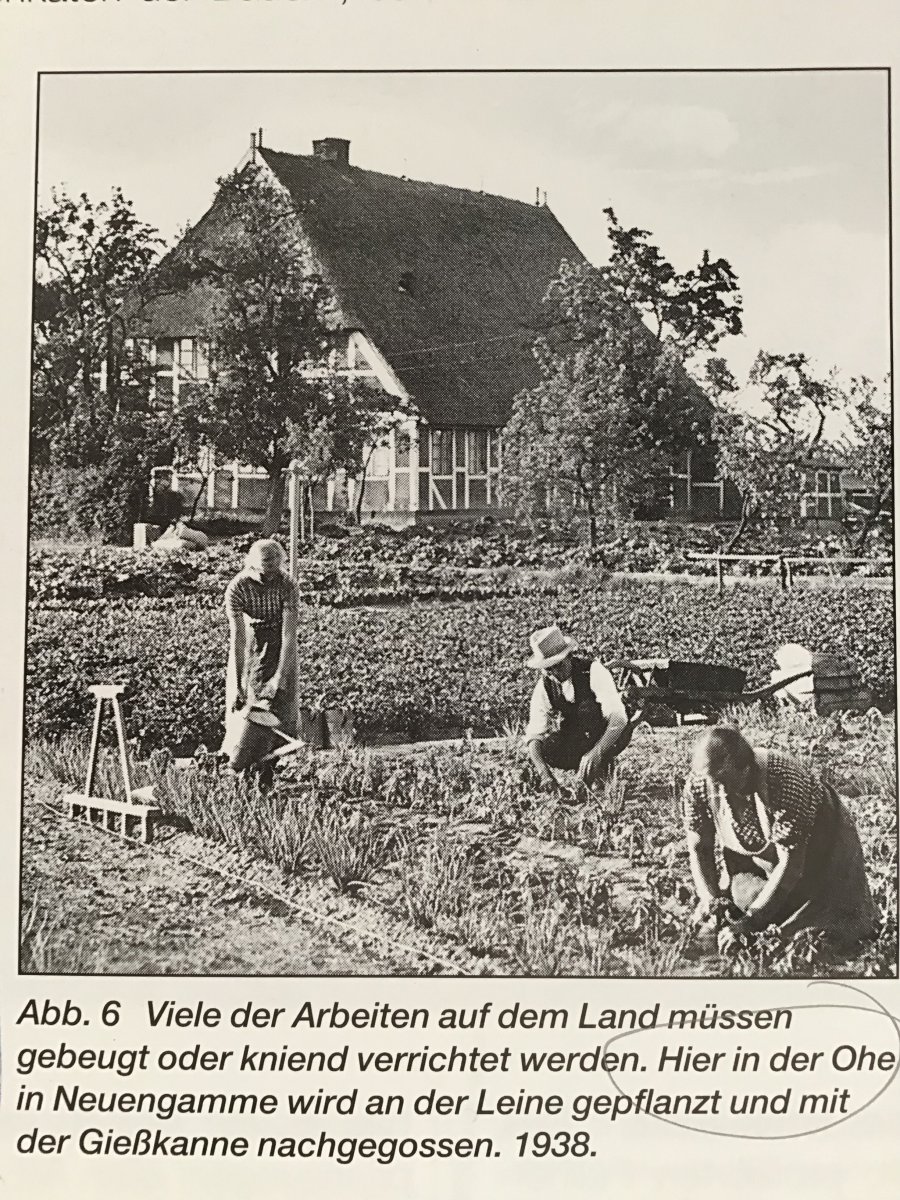 Gartenbau in Neuengamme, Achter de Wisch, 1902. Die langen Bohnenstangen wurden damals intelligenterweise aus Eichenholz hergestellt, sie waren – das hab ich gerade von meinen Nachbar*innen in Neuengamme gelernt – auf Grund des hohen Gerbstoffgehaltes sehr lange haltbar und wurden gut gehütet. Es gibt – noch! – enorm viel gärtnerisches Wissen in diesen Landen. Wilhelm Weimar.