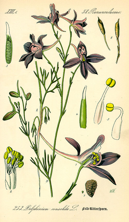 Wie ihr auf der Illustration unten gut erkennen könnt, sind die Blätter des Feld-Rittersporns in schmale, etwa einen Millimeter breite Zipfel zerteilt. Auf dem Foto oben, es stammt aus dem Kalender der LOKI SCHMIDT STIFTUNG, der ich auch botanisch vertraue, sind handförmig geteilte Blätter mit vielen Zipfeln zu sehen, wie. Ich denke, dies ist die gestauchte Blatt-Rosette am Stängelgrund, mit der der Feld-Rittersporn überwintert. Der Feldrittersporn gehört zu den Hahnenfußgewächsen, das erklärt auch die Sache mit den unterschiedlichen Blättern in der Rosette (Foto oben) und am Stängel (Grafik), denn viele Angehörige dieser Pflanzenfamilie weisen Heterophyllie auf, „Verschiedenblättrigkeit“.