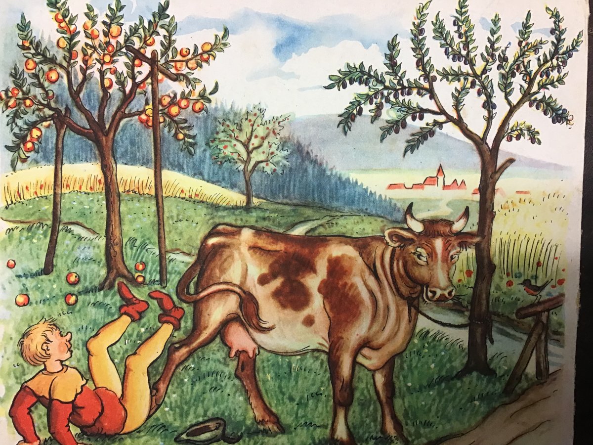 Mit der Nutzung der Ressourcen dieses alten Tieres hatte Hans laut dem nach ihm benannten Märchen kein Glück. Es gab keine Milch; hatte aber in der vielgestaltigen Kulturlandschaft sicher ein schönes Leben. Beachtet die strukturreiche Kulturlandschaft, den Mohn im Kornfeld, das Streuobst, das Rotkehlchen. Es war einmal – und warum sollte es nicht wieder werden?