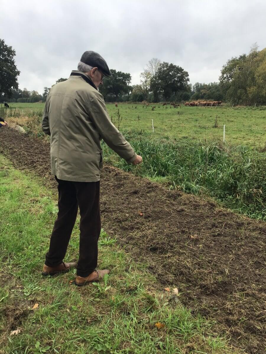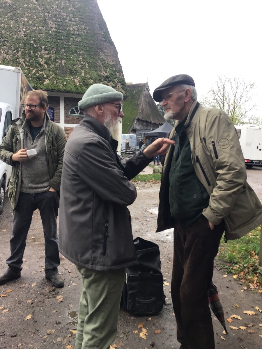 Da habt ihr die „üblichen Verdächtigen“ auf „einem Haufen“. Henning Beeken (links mit Kaffeetasse) musste zu Präsentation und Aussaataktion auf seinem Hof (https://hof-eggers.de) nicht überredet werden, biologische Vielfalt gehört dort einfach dazu. John Langley (mittig mit Mütze) war Schüler bei Loki Schmidt, ist heute Gartenbotschafter – auch für die Stiftung seiner Lehrerin -, ihm gehts stets um ökologische Garten- und Landpflege, er versteht all diese kultivierten Flächen als Lebensräume für Pflanzen, Tiere und Menschen; davon muss Langley Altbauer Georg Eggers (rechts, mit Schirmmütze) nicht überzeugen. Im Gegenteil: Georg geht das alles zu langsam mit der Agrarwende, er drückte mir am 23.10. „für meine nächste Schrift“ eine neue Studie zur Welternährung in die Hand. Und ich haue in die Tasten. Was sind das für Zeiten, wo manche Alten ungeduldig werden, und manche Junge sich KI-gefüttert im Sessel zurücklehnen?