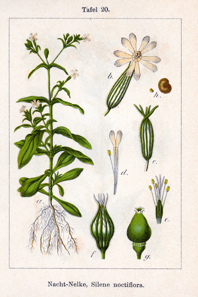 In meinem „SCHMEIL-FITSCHEN“ von 1973, dem dunkelgrünen Buch zum Bestimmen der wildwachsenden und häufig kultivierten Gefäßpflanzen (wobei mit Gefäß hier nicht Blumenvase oder -topf gemeint ist, sondern die Gefäße, in denen Blütenpflanzen wie die Acker-Lichtnelke, aber auch Bärlappgewächse und Farne Wasser und darin gelöste Stoffe durch ihre Wurzeln, Blätter und Sprosse befördern) von Deutschland und seinen angrenzenden Gebieten heißt Silene noctiflora auf Deutsch Acker-Nachtnelke. Im Kurztext zur Bestimmung steht dort, dass ihre weißen bis bleichrosafarbenen Blüten in „gabelästigen“ Blütenständen stehen und sich erst gegen Abend öffnen. Ihr süßlicher, kleeartiger Duft lockt Nachtfalter während Tagfalter auf Buntes fliegen, orientieren sie sich eher nach dem Geruch.