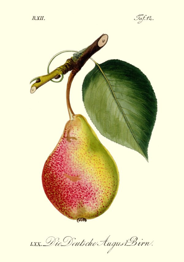 Fürs Hamburger Traditionsgericht „Bohnen, Birnen und Speck“ braucht ihr nicht unbedingt Schweinebacke (wenn schon denn schon, dann von glücklichen Schweinen wie denen auf Hof Eggers in der Ohe), aber unbedingt die kleinen, harten Augustbirnen. Sie sind weder süß noch fruchtig. Wenn in einem Restaurant das ganze Jahr über „Bohnen, Birnen und Speck“ auf der Karte stehen, muss eine als Norddeutsche das Schlimmste befürchten, denn auch die einheimischen Brechbohnen haben ihre Saison nur im August. Bund Lemgo, Obstsortendatenbank